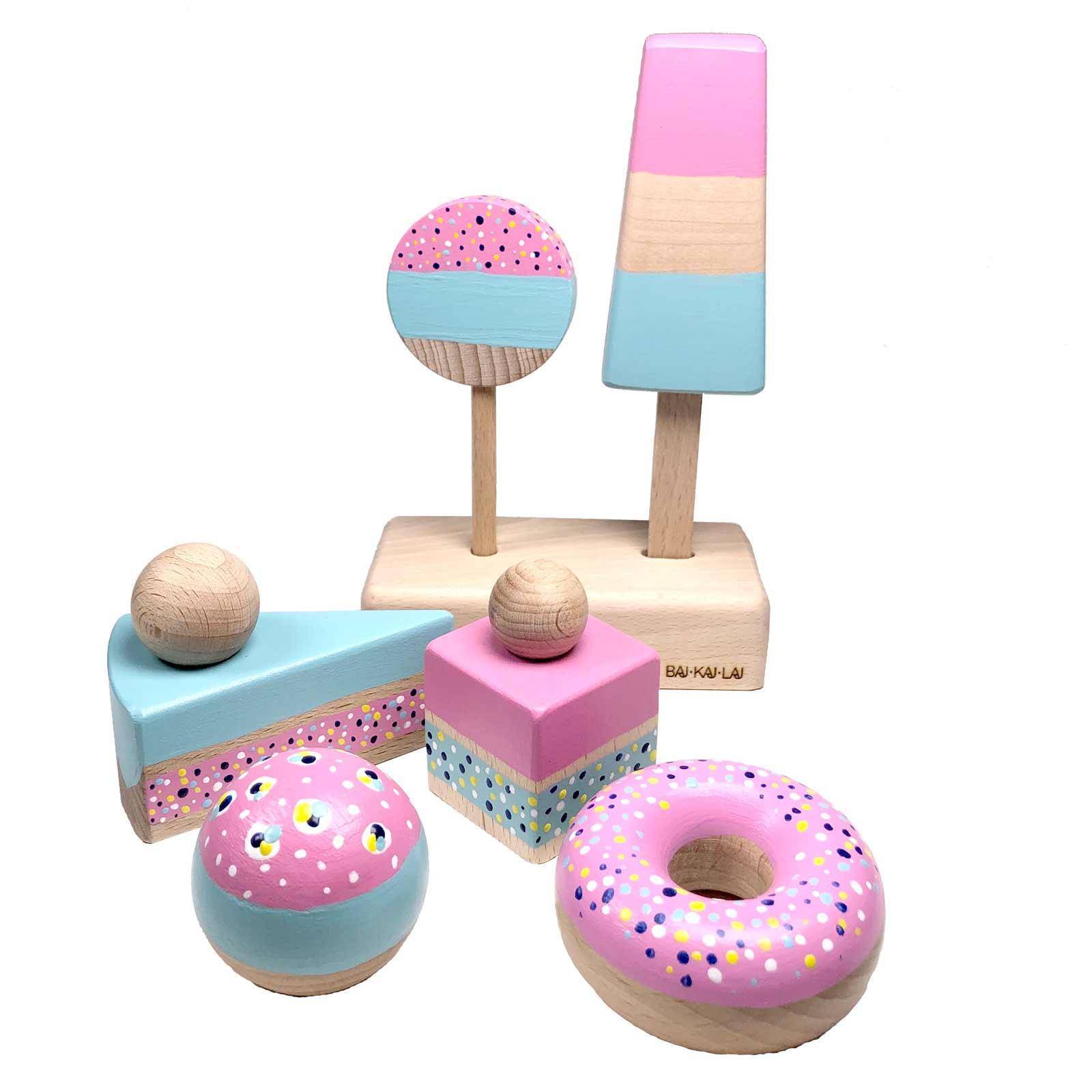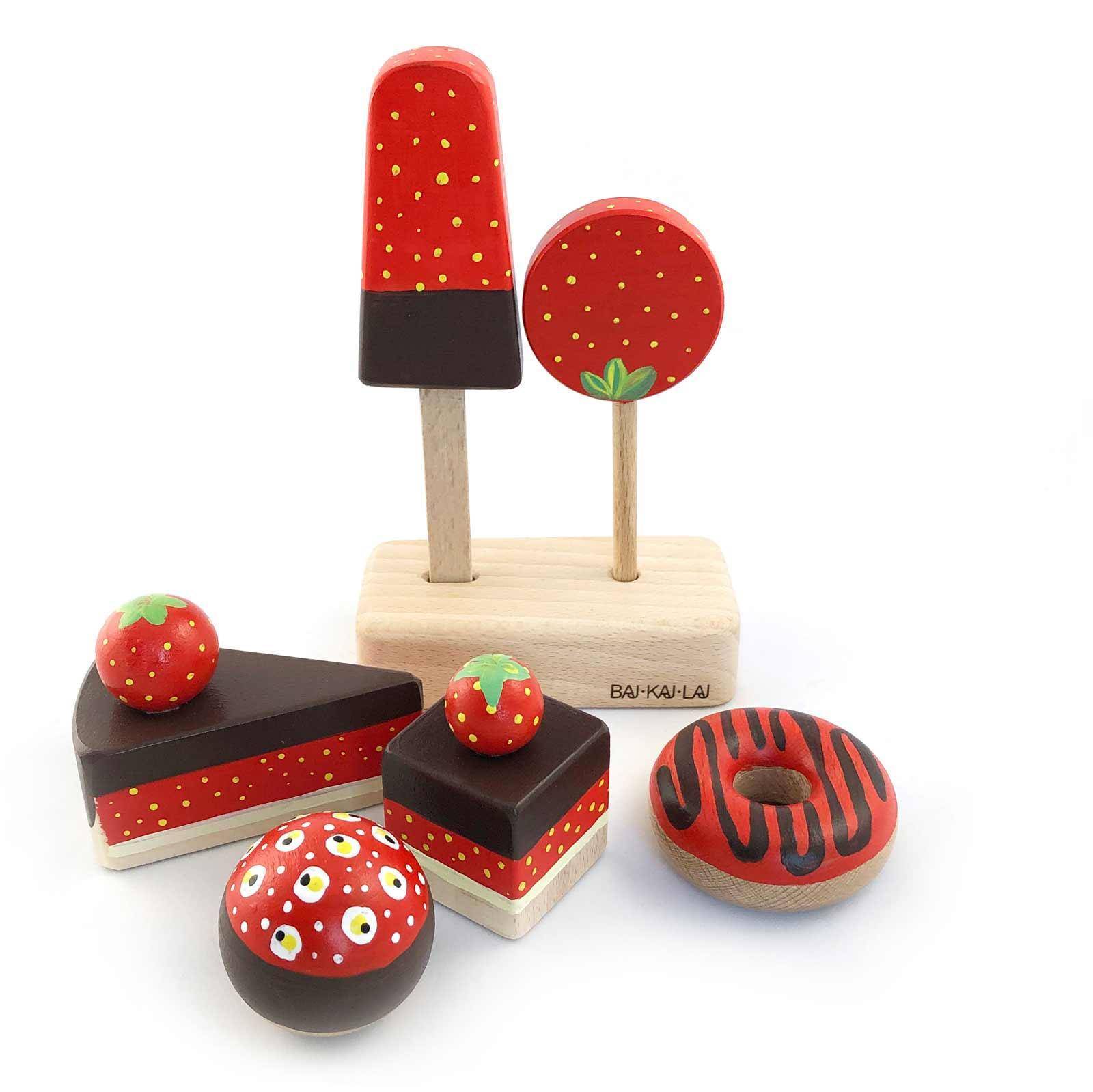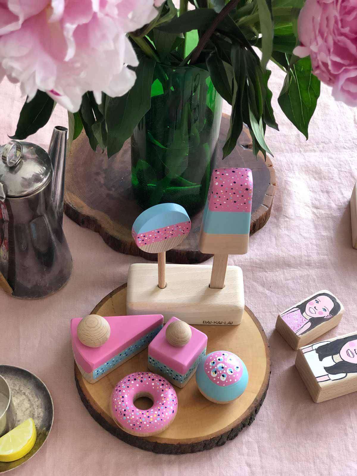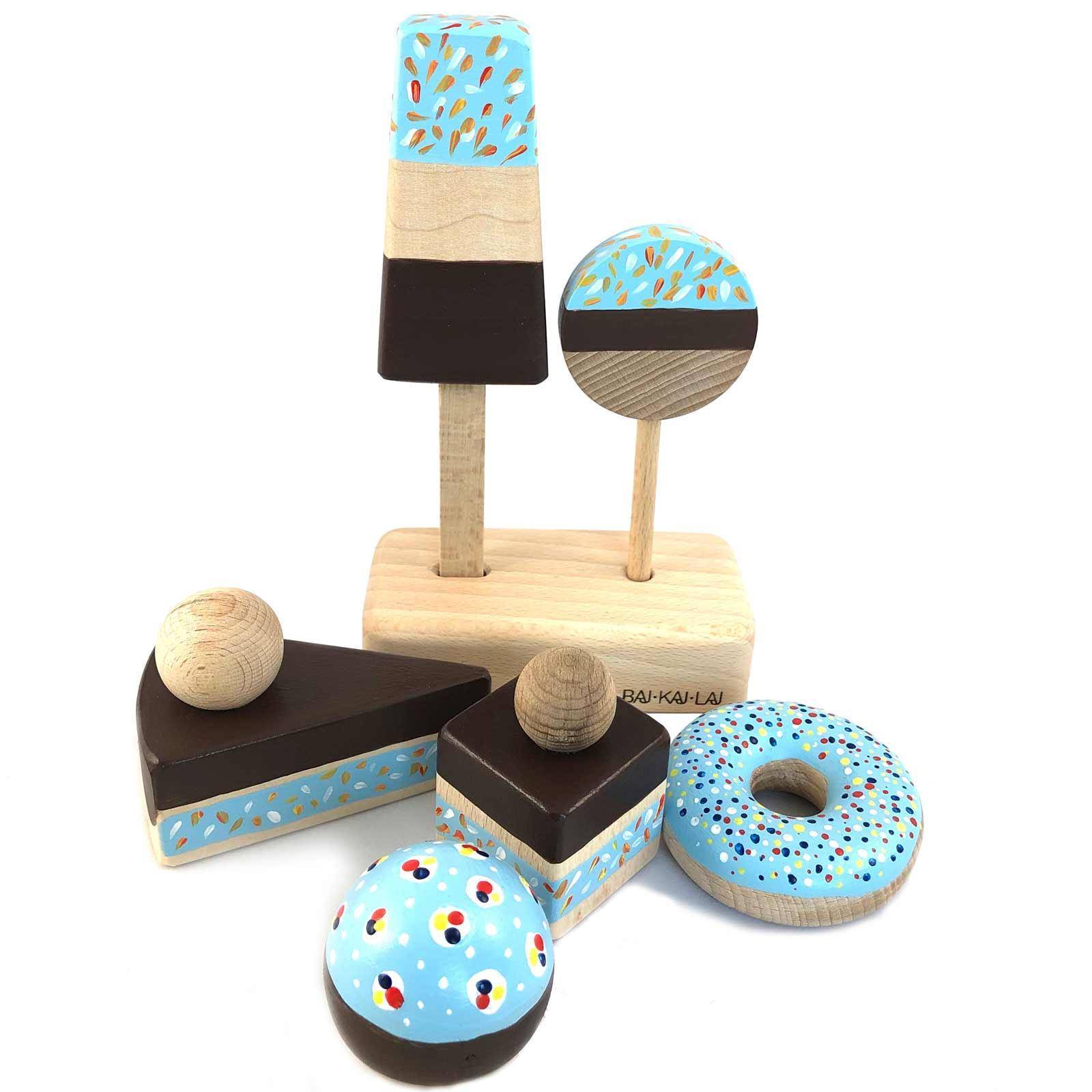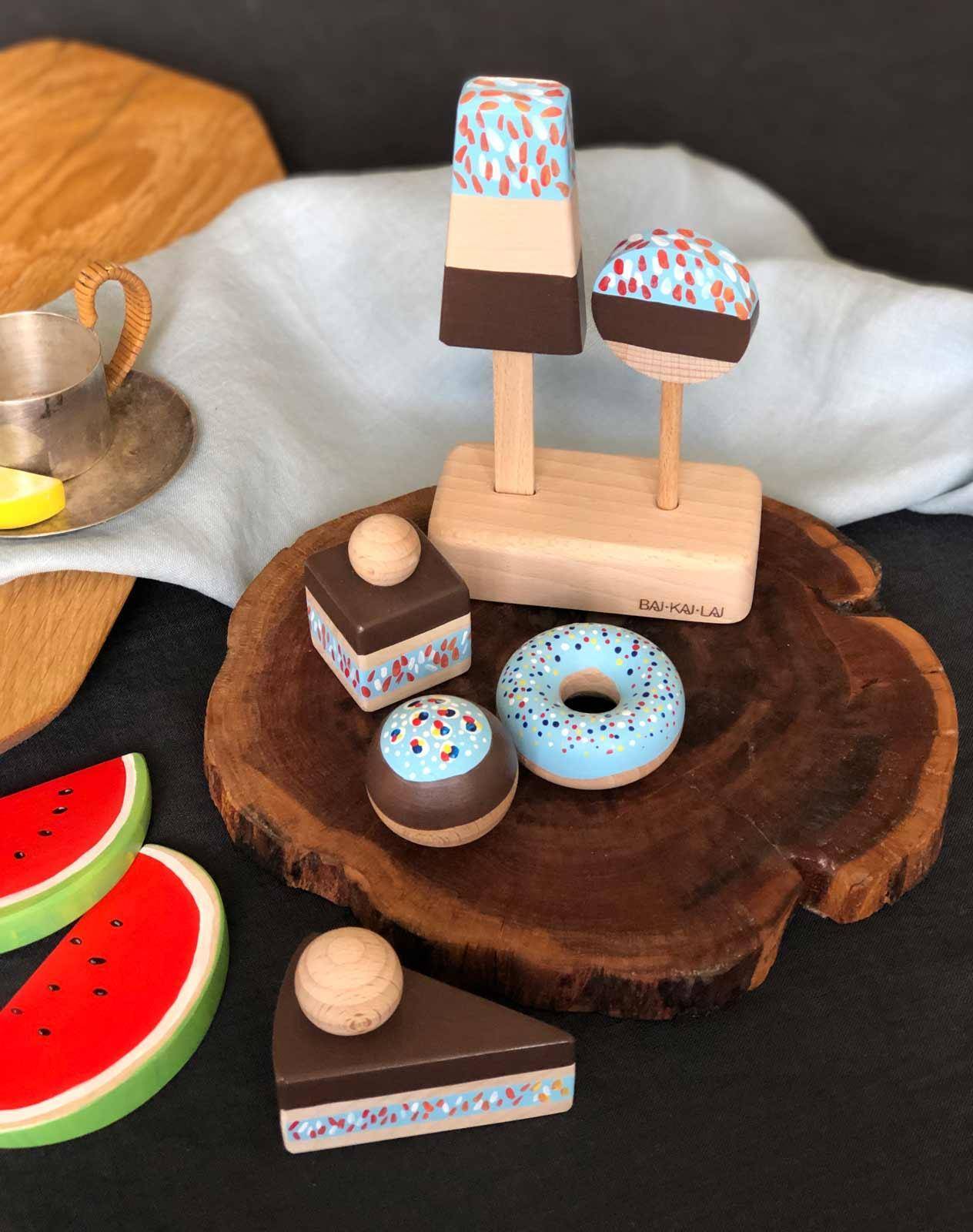 Sada složená z nanuku, lízátka, dortíku, řezu, pralinky, donutu a stojánku,